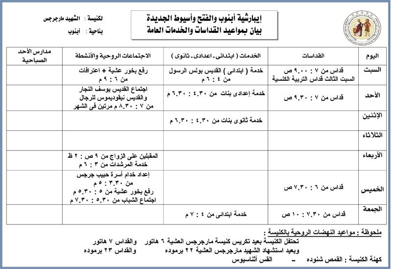 العنوان : أبنوب ـ محافظة أسيوط تاريخ إنشائها : كنيسة قديمة وتم إعادة بنائها وتوسيعها فى 2019 م تاريخ التجديد : – صدر لها قرار رقم 953 لسنة 2019 بإحلال وتجديد وتوسعة مبنى الكنيسة على مساحة 750 م مربع ، وطبقا لقرار مجلس الوزراء رقم 13 لسنة 2019 الصادر لها ضمن مجموعة الكنائس التى يمكن توفيق أوضاعها النهضات السنوية : عيد استشهاد الشهيد مارجرجس 1 مايو من كل عام
