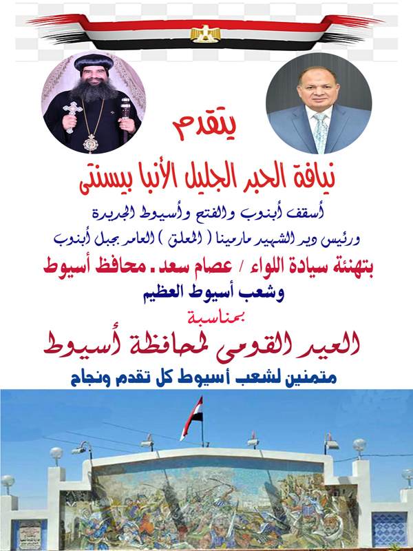 التهنئة بالعيد القومى لمحافظة أسيوطأبريل 19, 2023دير الشهيد مارمينا العجائبي بجبل أبنوبأبريل 29, 2023 التهنئة بعيد الفطر Share موضوعات مرتبطةأبريل 15, 2026استقبالات المهنئين بعيد القيامة المجيد بمقر المطرانيةالمذيدأبريل 15, 2026تهنئة أبنائنا من ذوى القدرات الخاصة بعيد القيامة المجيدالمذيدأبريل 15, 2026استقبالات المهنئين بعيد القيامة المجيد بمركز خدمات الكاروز بمدينة أسيوط الجديدةالمذيد