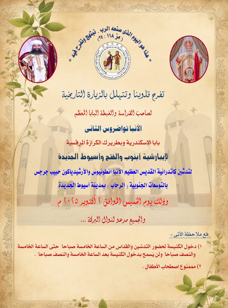 الإصحاحات المتخصصة (1): المحبة – ج 2سبتمبر 27, 2025قداس عيد الصليب المجيد بكنيسة الشهيد أبي سيفين بقرية الحمامسبتمبر 28, 2025 بيان بخصوص تدشين كاتدرائية القديس الأنبا أنطونيوس والأرشيدياكون حبيب جرجس Share موضوعات مرتبطةأبريل 15, 2026استقبالات المهنئين بعيد القيامة المجيد بمقر المطرانيةالمذيدأبريل 15, 2026تهنئة أبنائنا من ذوى القدرات الخاصة بعيد القيامة المجيدالمذيدأبريل 15, 2026استقبالات المهنئين بعيد القيامة المجيد بمركز خدمات الكاروز بمدينة أسيوط الجديدةالمذيد