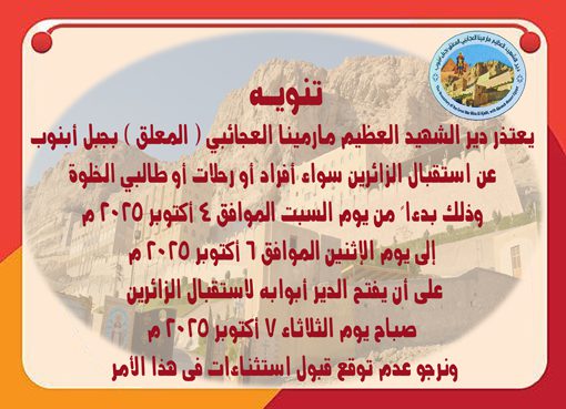 تنويهسبتمبر 28, 2025لحظة تدشين كنيسة القديس الأنبا أنطونيوس والقديس الأرشدياكون حبيب جرجس، بيد قداسة البابا تواضروسأكتوبر 7, 2025 تنويه هام من دير الشهيد مارمينا العجائبي بجبل أبنوب Share موضوعات مرتبطةأبريل 15, 2026استقبالات المهنئين بعيد القيامة المجيد بمقر المطرانيةالمذيدأبريل 15, 2026تهنئة أبنائنا من ذوى القدرات الخاصة بعيد القيامة المجيدالمذيدأبريل 15, 2026استقبالات المهنئين بعيد القيامة المجيد بمركز خدمات الكاروز بمدينة أسيوط الجديدةالمذيد