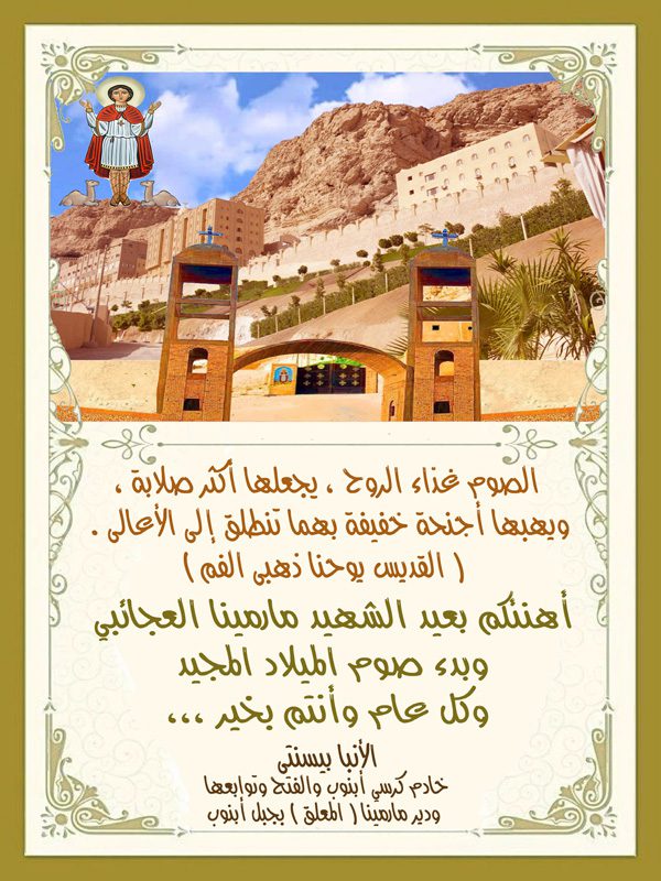 التهنئة بعيد استشهاد القديس مارمينا وبدء صوم الميلاد المجيد