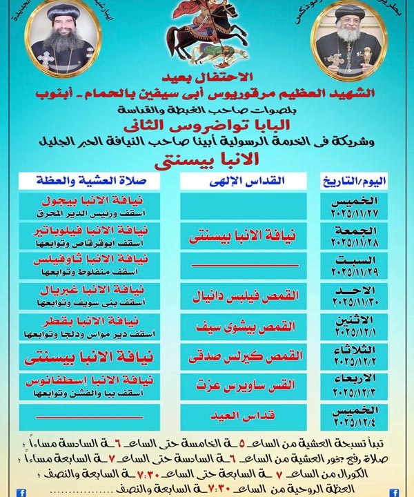 الأربعاء 3 ديسمبر 2025 صلى نيافة الحبر الجليل الأنبا بيسنتى عشية عيد استشهاد القديس أبي سيفين بكنيسته بقرية الحمام ، وقام نيافته بتطييب رفات الشهيد والدورة […]